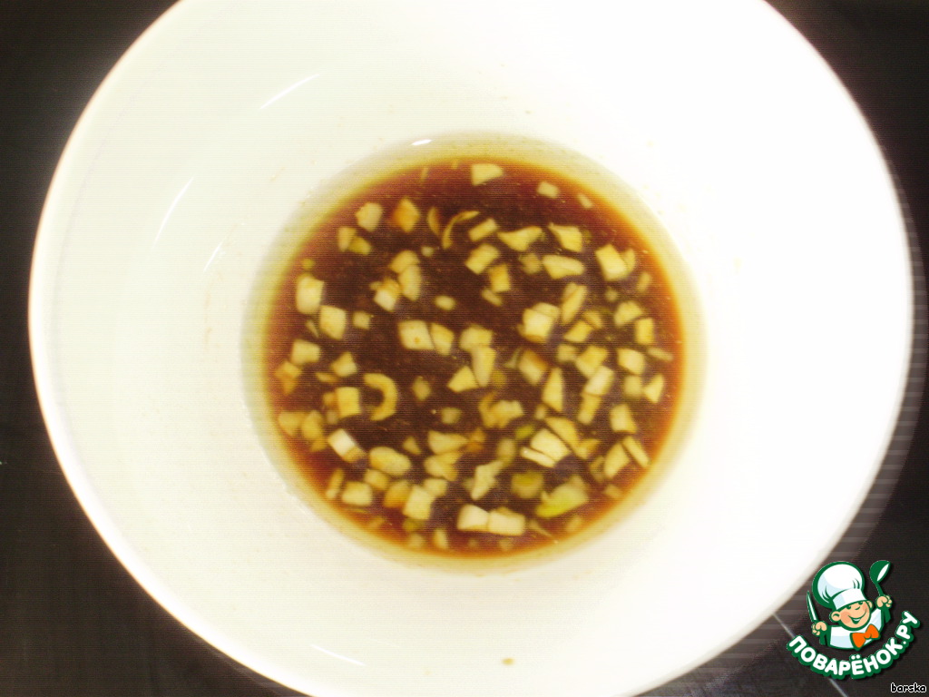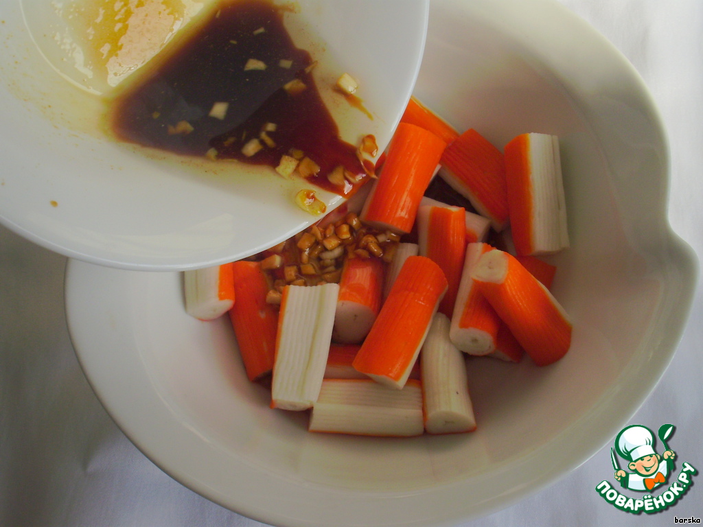 Для маринада крабовых палочек: смешать 2 ст.л. соевого соуса, 3 ст.л. растительного масла, 1 ст.л. лимонного сока, 1 ч.л. сахара, 0,5 ч.л. молотого имбиря и 1 зубчик мелко порезанного чеснока.