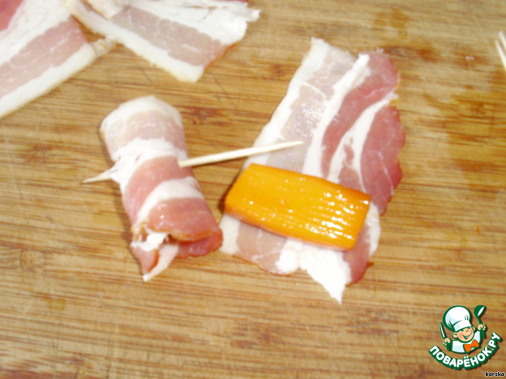 Маринад слить. Каждую полоску бекона разделить напополам и завернуть кусочек крабовой палочки, сколоть зубочисткой.