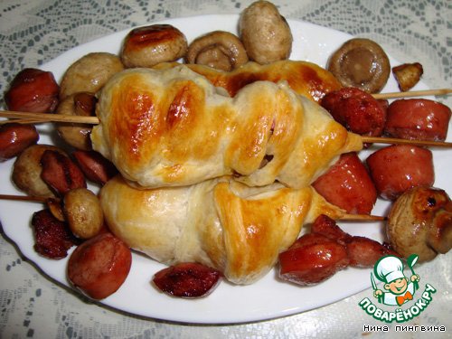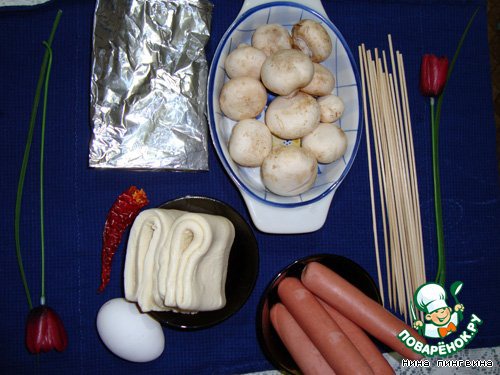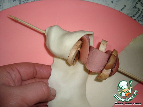 Режем сосиску полосами на 3 части и грибочки аналогично.Надеваем на шпажки как указанно на фото