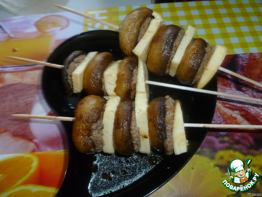 Насаживаем на шпажки, чередуя фаршированные шляпки шампиньонов с кусочком сыра