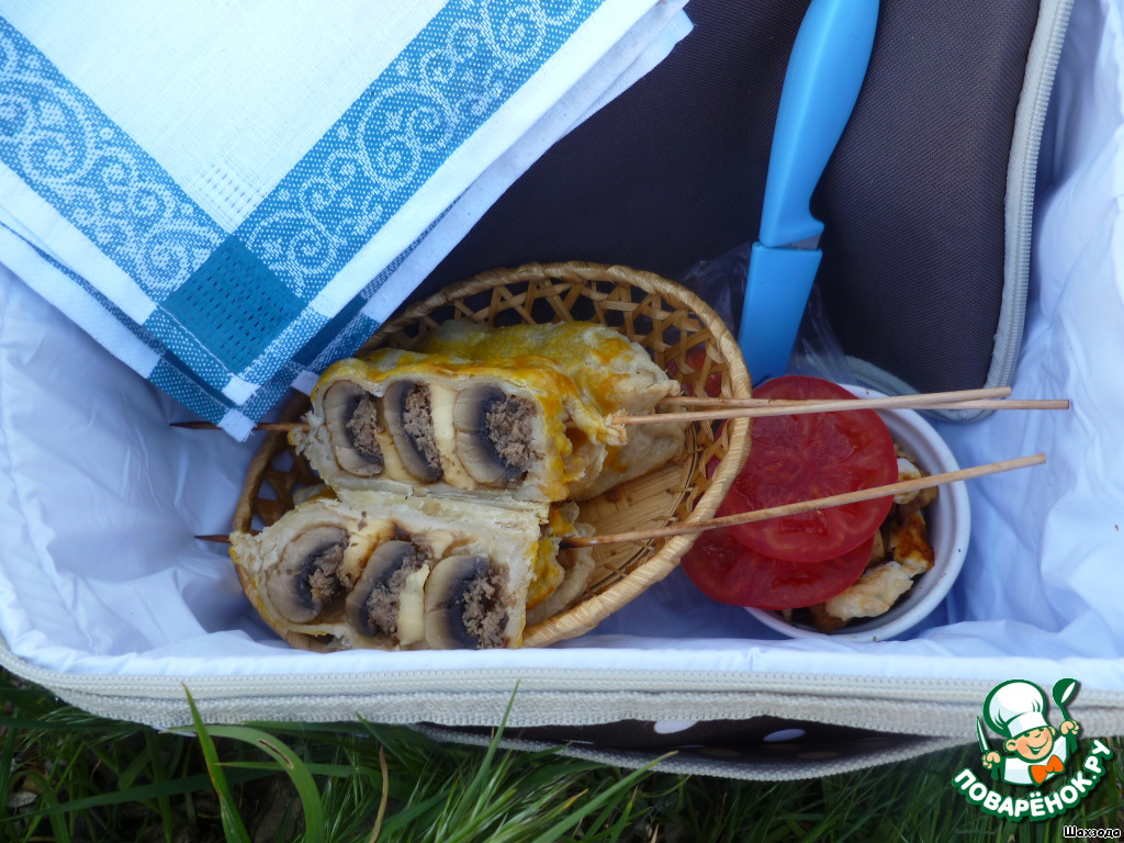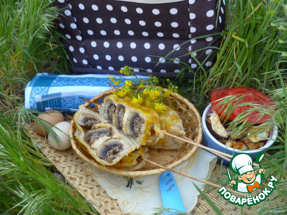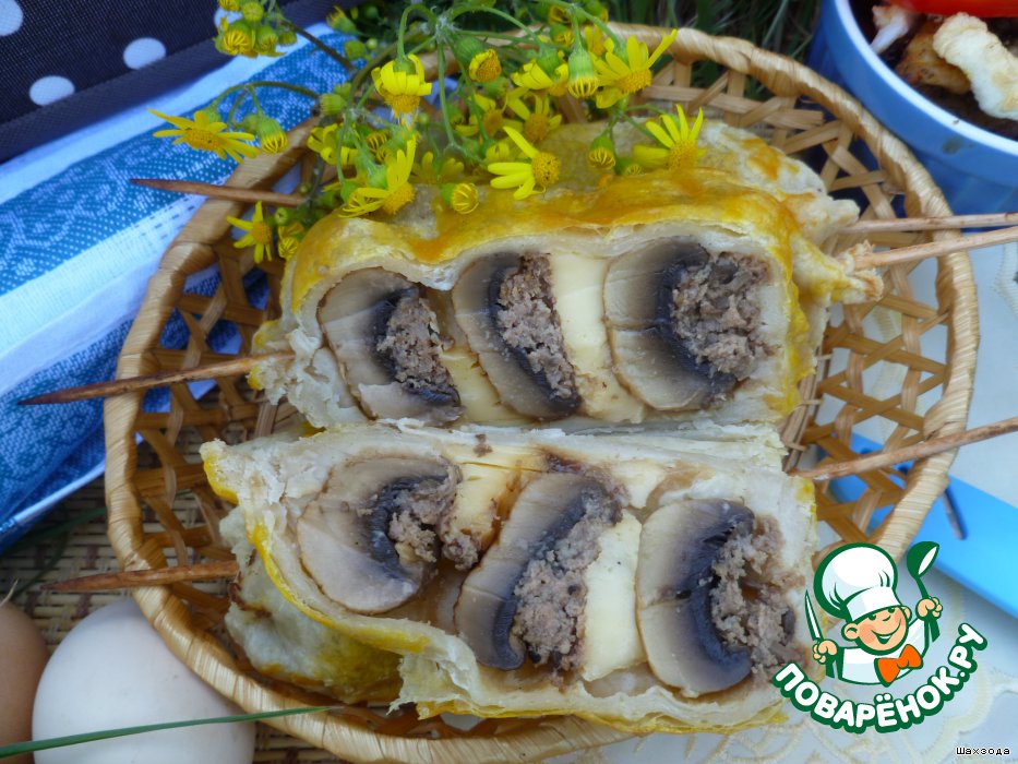 Раскатываем тесто (предварительно его разморозив) и заматываем шпажки с грибами, защипнув края.