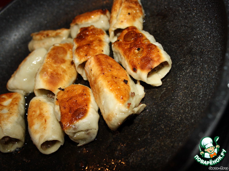 Вынуть бораки, выложить на сито, дать стечь бульону и обжарить их на предварительно разогретой сковороде со всех сторон по 1 минуте (до появления золотистой корочки).
