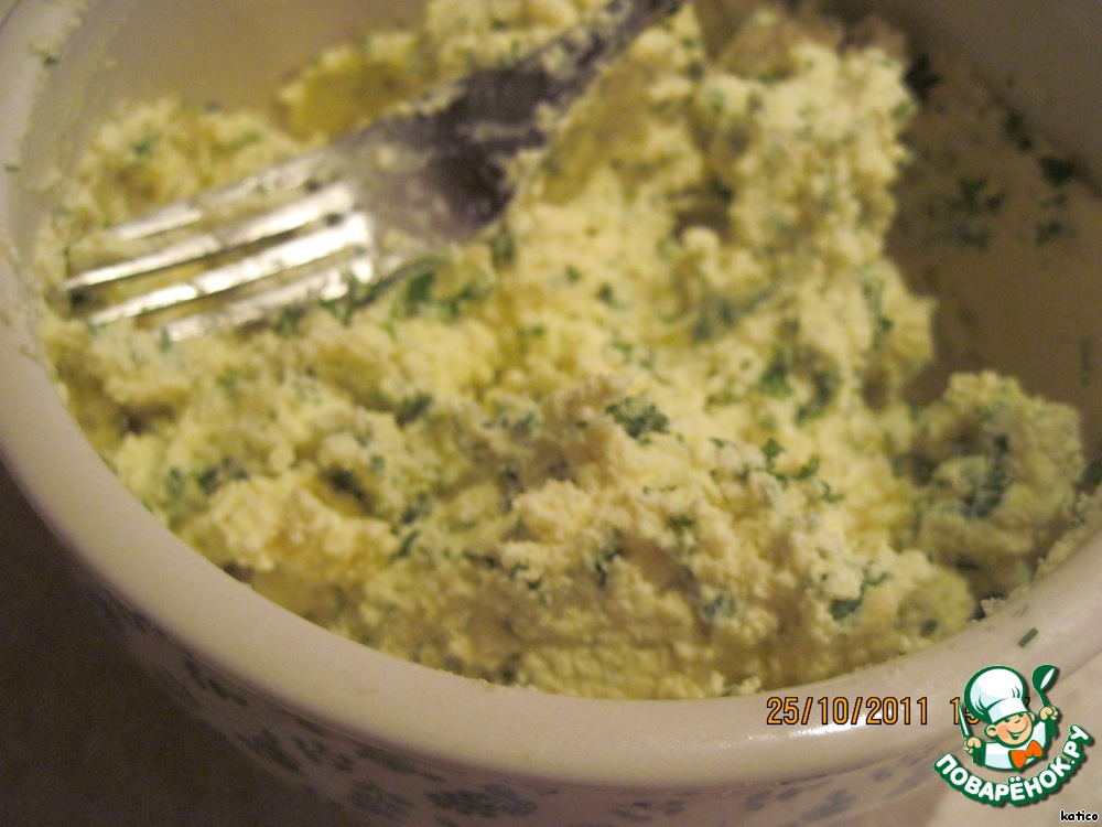 Творог растереть с манкой и крахмалом (берите больше или меньше, в зависимости от влажности творога), добавить яйца (если маленькие, то 3), мелко порубленную зелень укропа и петрушки, посолите.