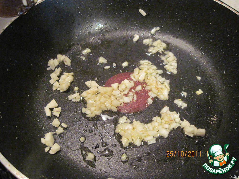 Чеснок мелко порубить и слегка обжарить в минимальном количестве оливкового масла.