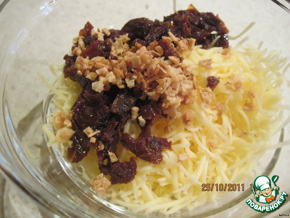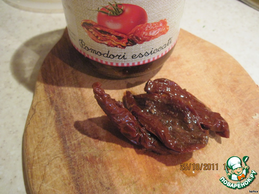 Вяленые помидоры мелко порезать, кстати, у кого их нет под рукой, можно взять чернослив или жареные грибы.
