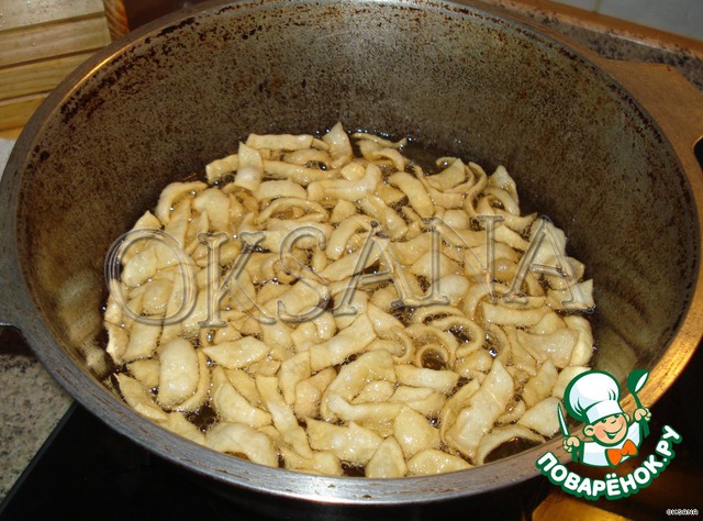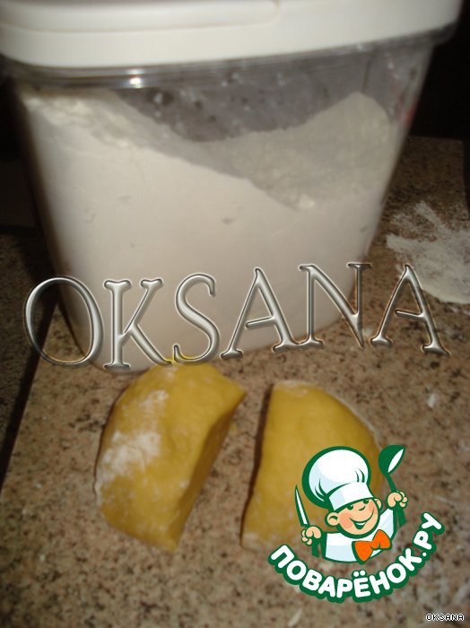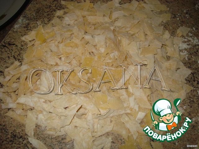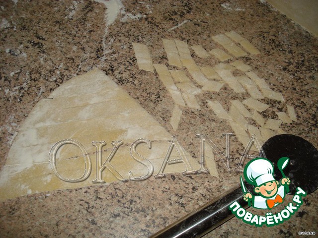 Когда раскатываем кусочки теста(толщина 2-3 мл.) на столе,потом делим их на такие части,чтобы удобно было резать .