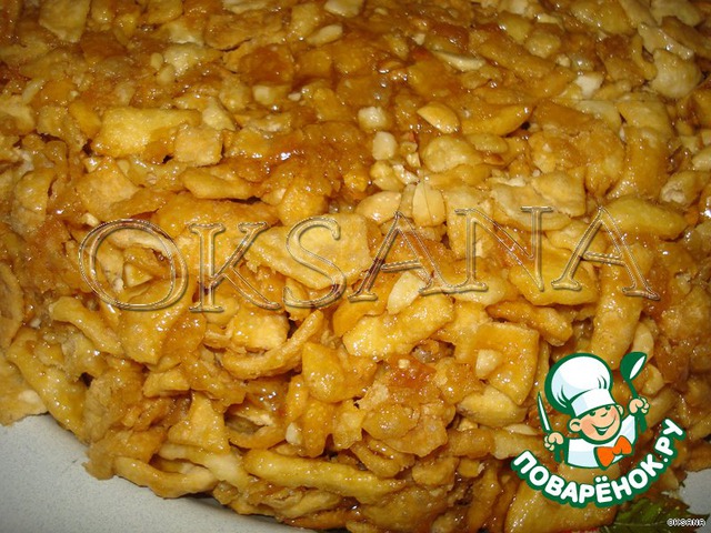 Когда сироп готов - выливаем его в наши поджаренные кусочки теста и хорошо перемешиваем( сироп должен повсюду распределиться).