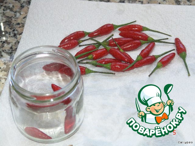 Промываем перчики под холодной водой. Сушим, лучше на гигроскопичной бумаге или ткани. На них не должно остаться ни капельки воды. Отрезаем зеленые хвостики, укладываем в приготовленную баночку.