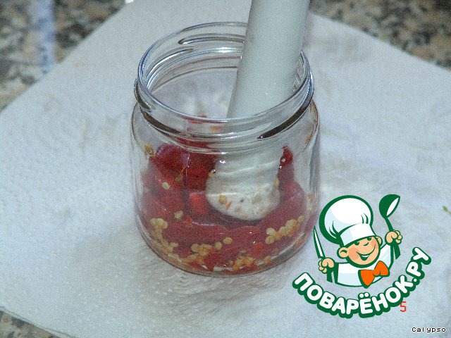 Пестиком от ступки раздавливаем перчики. (Над баночкой лучше не дышать!)