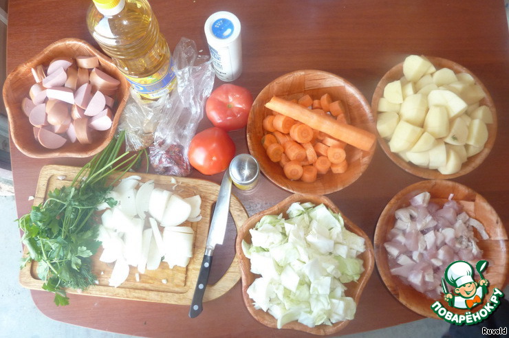 Вот все ингредиенты, которые нам понадобятся для сего блюда. Не обращайте внимания на сардельки, очень уж хотелось кушать, решил сначала их пожарить, да и вкус блюда от них станет только лучше.