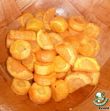 Теперь настал черёд морковки, режем толстыми колечками (1-1,5см), отправляем в казан, пусть тоже подрумянится на большом огне и отдаст маслу свой сладковатый вкус и красивый оранжевый цвет. Опять выкладываем на тарелочку.