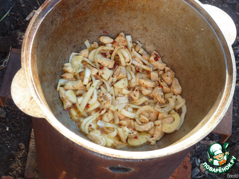 Сливаем из казана половину масла (можно даже больше), мы же хотим кушать нежирное и полезное. Выкладываем очищенную от костей, нарезанную небольшими кусочками куриную грудку и кожу (кто не любит кожу, естественно, её не кладём, но поверьте: её потом совсем не чувствуется, а навар получается более насыщенным). Немного солим, добавляем приправы, через пару минут отправим туда же лук и немного подождём, пока не станет полупрозрачным.