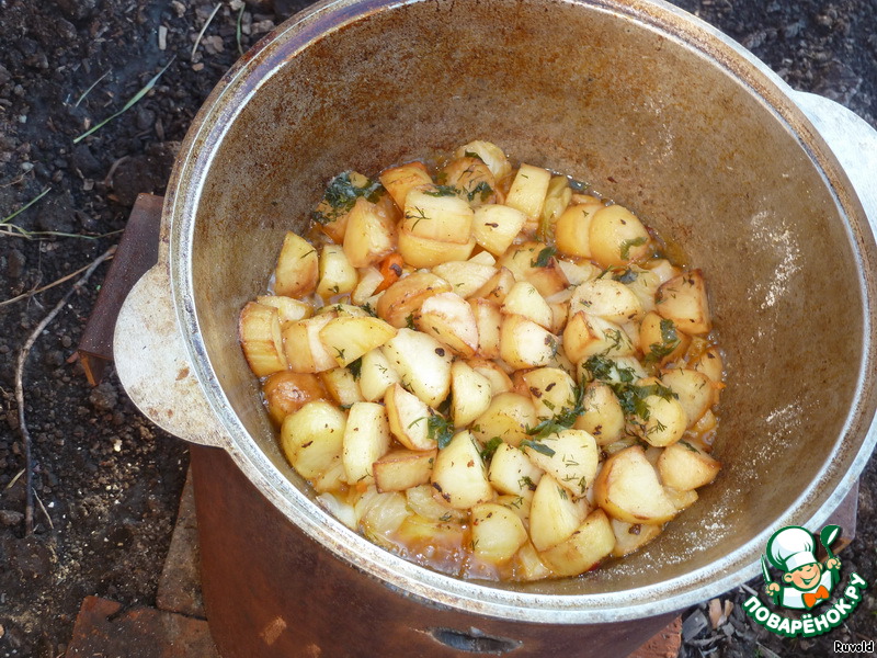 Высыпаем в казан крупно порезанную картошечку, обжариваем до хрустящей румяной корочки и выкладываем на тарелку. Уже хочется откусить кусочек, но пусть ждёт своего часа...