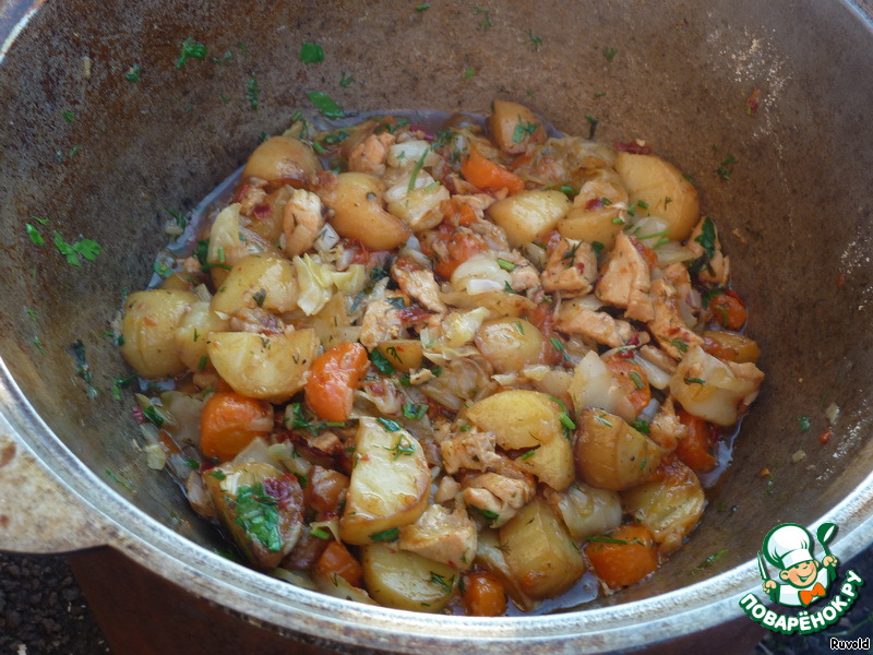 Ну вот и настал момент собрать наше блюдо. Выкладываем на нашу курочку помидорки, нарезанные колечками, и обжаренную морковку, укрываем шубкой из капусты, а поверх капусты выложим румяную картошечку, посыплем солью и зеленью. Дольём немного воды, буквально грамм 50-70, чтобы наша курочка не начала подгорать, а потом будет достаточно и того сока, что выделится из капусты и самой курочки. Закрываем казан крышкой. И теперь самое сложное, нужно подождать минут сорок не открывая крышку, пока наше рагу томится на медленном огне (ну а в моём случае - на углях).