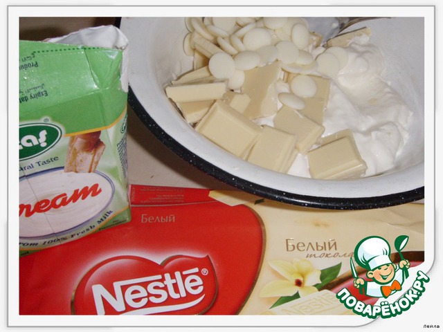 [b]Слова автора.[/b]Белый шоколад заменила на 80г.порошка ванильного пудингу.перемешала со сливками,получилась густая масса,похожая на растопленный шоколад.