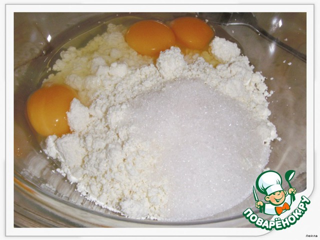 Отдельно смешать яйца ,творог и сахар,