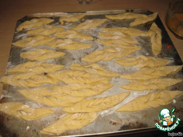 3. Раскатываем тесто, режем на полоски, а после на ромбы. В середине каждого ромба делаем надрез, пропускаем через него один конец и выворачиваем. Протыкаем слегка вилкой.
