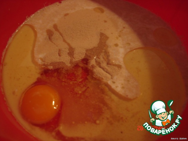 В теплое молоко добавить 1 яйцо, дрожжи, сахар, соль, рафинированное растительное масло и муку.