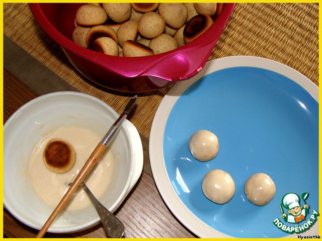 Орешек окунаем верхушкой в глазурь, потом кисточкой подмазываем края.