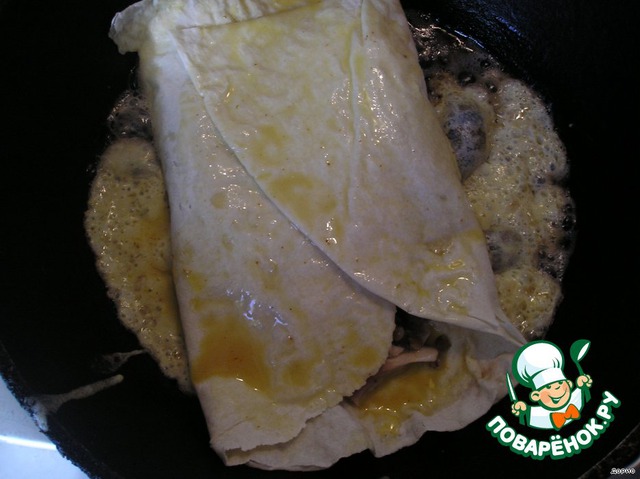Обмакиваем низ конвертика, а верх поливаем яичной смесью из ложки. На сковороду!