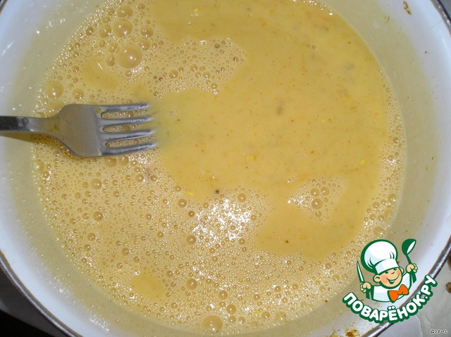 Слегка взбиваем яйца с солью и любимыми специями + 2-4 ст. л. воды.
