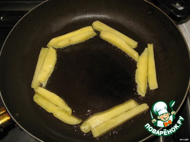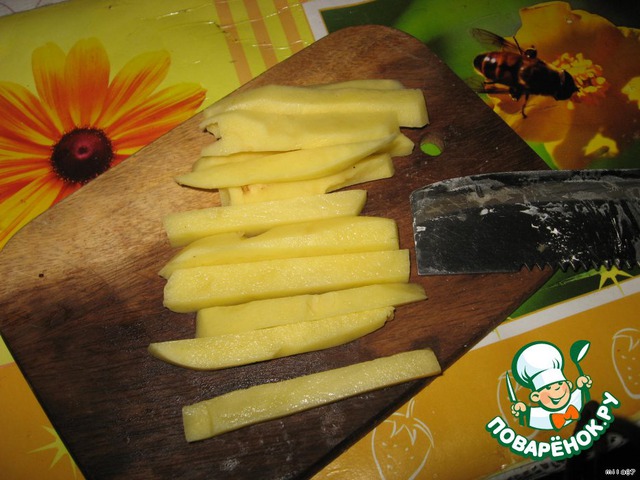 Тем временем очищаем картофель и режем его в длину соломкой, подходящего размера к предыдущим овощам.