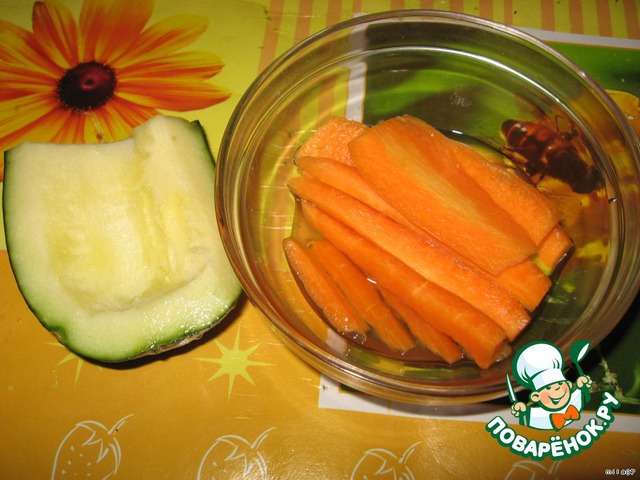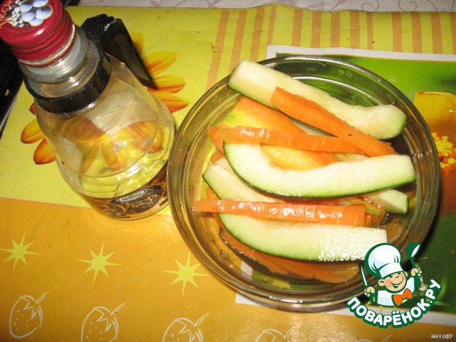 Делаем кислый раствор(пропорции не даю, уровень кислоты на ваш вкус), маринадом заливаем морковь, перчик, и цуккини, оставляем на время.