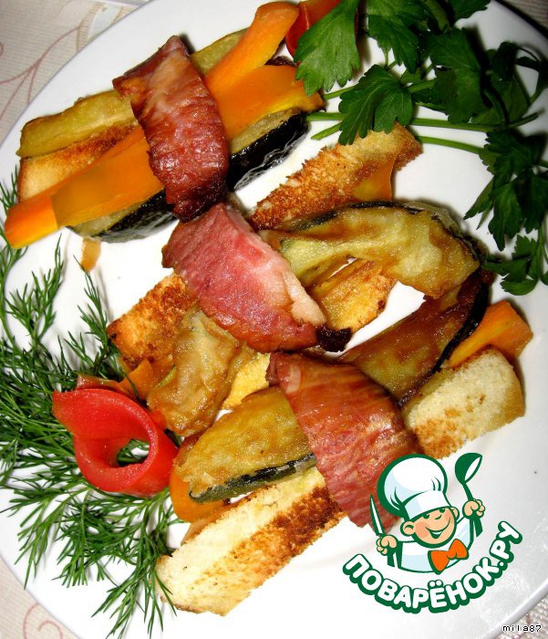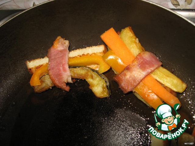Собираем наш сверток: укладываем бекон, на него кладем ломтики овощей, сворачиваем и кладем швом вниз, на раскаленную сковороду, слегка подрумянившись шов припечется, обжариваем слегка бекон и с другой стороны.
