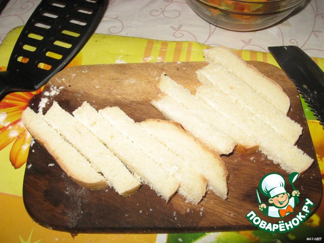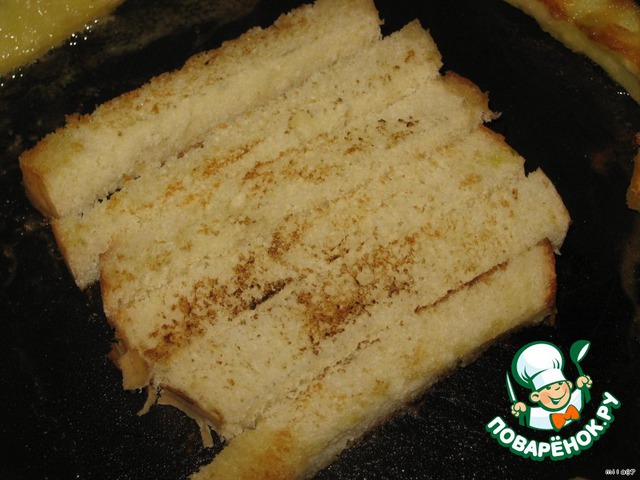 На слегка смазанной сковороде подсушиваем и ломтики батона.