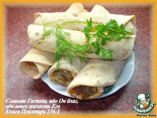 Готовую начинку кладем на наши лепешки и сворачиваем.