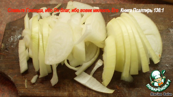Готовим начинку: режим лук полукольцами и на сковородку с подсолнечным маслом.