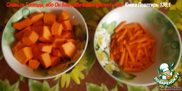 И так преступим. 400 грам тыквы режим на кусочки добавляем пол стакана воды и на 10 минут в микроволновку. А 100 грам тыквы понадобится для начинки его мы сразу шинкуем соломкой.