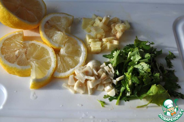 Нарезаем полукольцами лимон, мелко нарезаем кинзу, имбирь и чеснок.