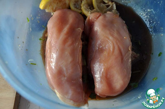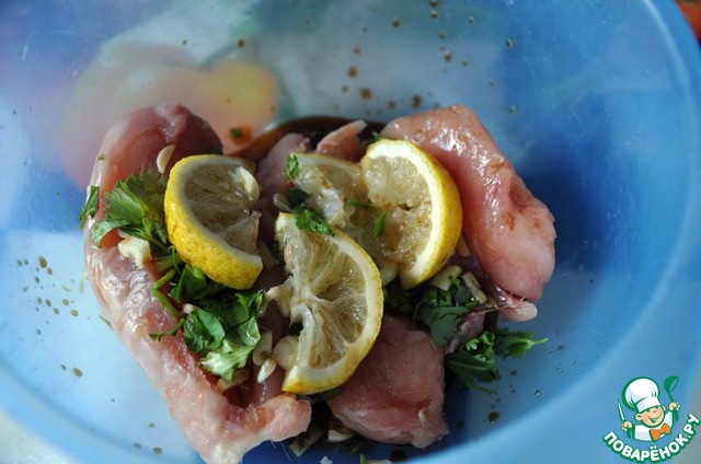 Сверху грудок укладываем лимон, имбирь, чеснок, кинзу, поливаем терияки-маринадом от Blue Dragon (50 мл), оливковым маслом и оставляем мариноваться в холодильник, лучше на ночь.