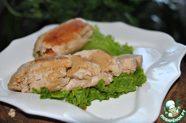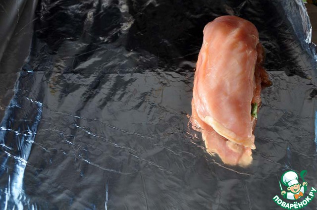 Маринованные грудки "фаршируем" кинзой, имбирём и чесноком из маринада.
