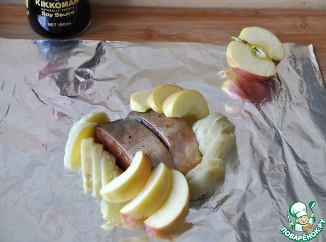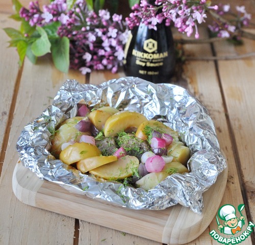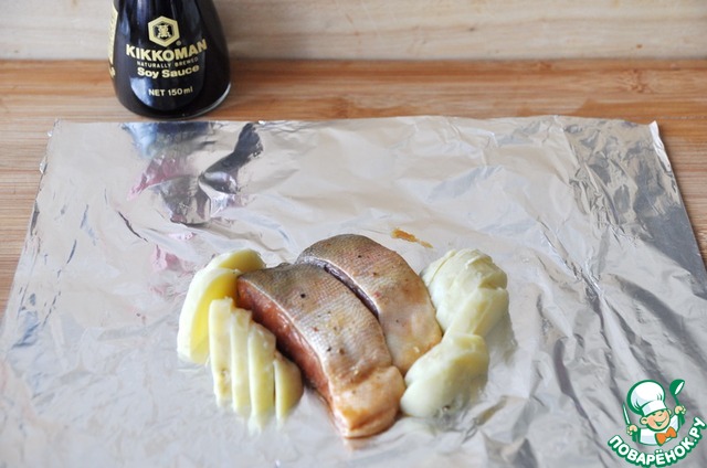 Берём лист фольги, сворачиваем вдвое, посредине кладём маринованный лосось. Вокруг кладём отваренный в "мундире" картофель, нарезанный на сегменты.