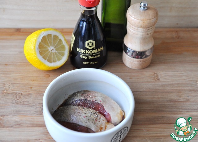 Маринуем рыбу в соевом соусе "Киккоман", лимонном соке, оливковом масле, посыпаем свежемолотой смесью перцев.