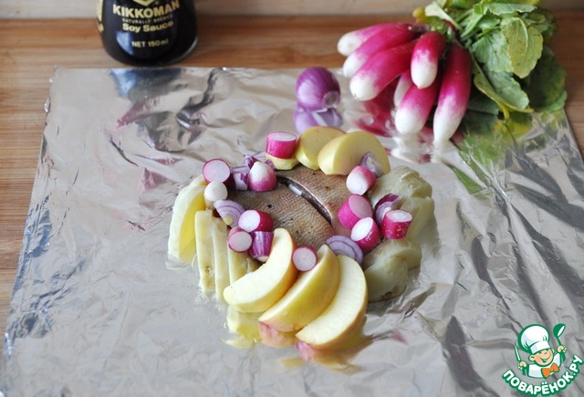 Берём яблоко, удаляем сердцевину, режем на сегменты и также кладём вокруг рыбы.