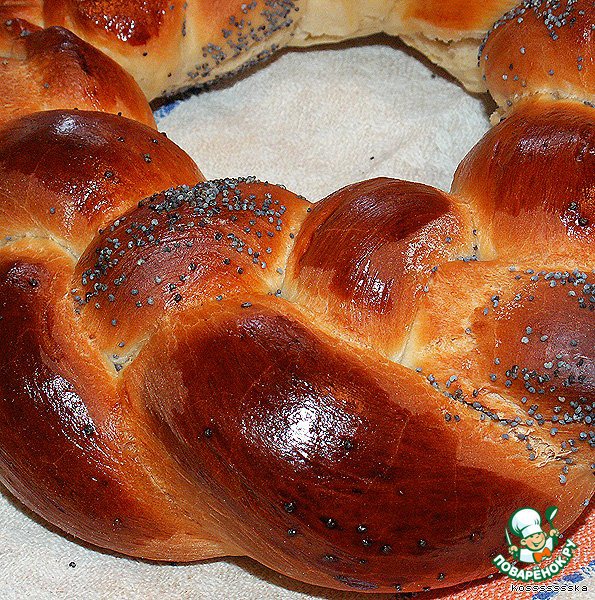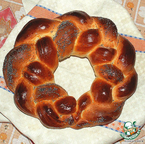 Сворачиваем косичку в венок, укладываем на противень, мажем желтком непосыпанные жгутики
