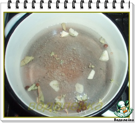 Смешать воду, уксус, порезанный чеснок, перец, лавровый лист, гвоздику и соль.(но соль я бросала не всю сразу. Вначале бросила 0.5 ст.л, а после пробы добавила еще немного). Доводим до кипения.