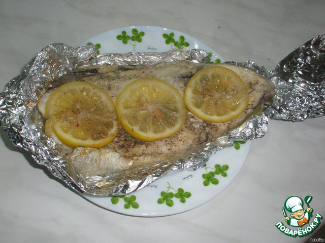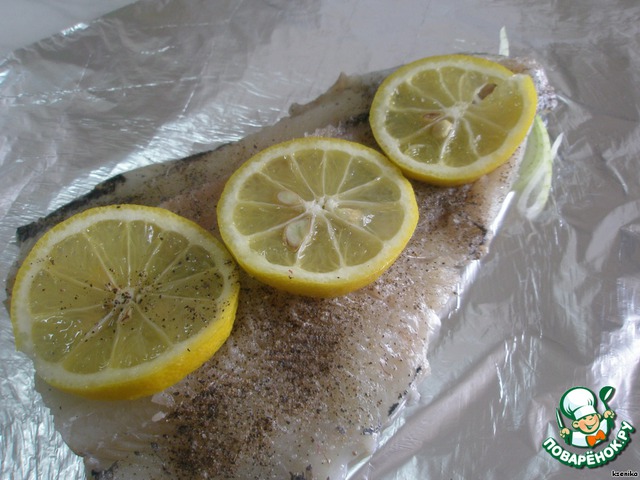 Выкладываем нашу рыбку, солим, перчим, кладем лимончик.