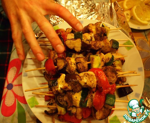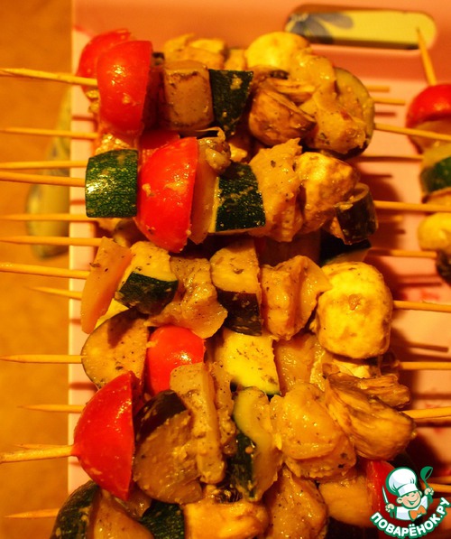 А теперь начинается самое сложное. Берем шпажку и насаживаем на нее в произвольном порядке: кабачек, баклажан, помидор, перчик, грибочек, перемежая овощи кусочками курочки (парой штук). Занятие кропотливое и требует терпения, что бы на каждой шпажке присутствовали все овощи. Но результат того стоит. Вот какая красота в итоге получается: