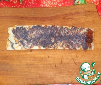 Смазываем полосочки маковой начинкой, накладываем полоски друг на друга и на край кладем несколько изюминок.