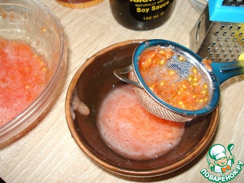 Томаты перетрем на мелкой терке, процедим через частое ситечко. Нам нужна одна жидкость.