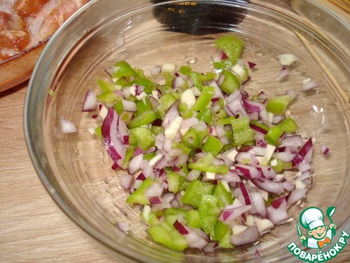 Перед жаркой шашлыка нарежем мелко перец чили (можно меньше). Красный лук и чеснок. Перемешаем. Пока отставим в сторону.