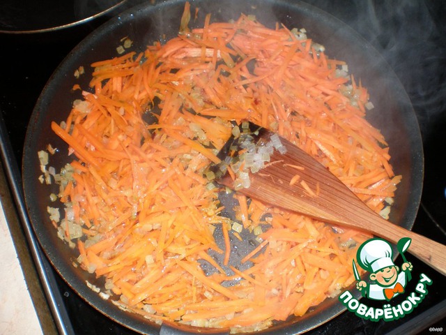 лук нарубить, обжарить на растительном масле до золотистого цвета