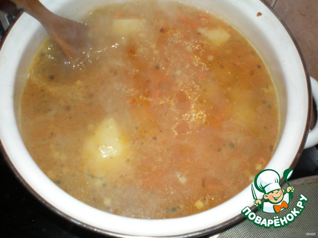 Я всегда, для того чтобы супчик был наваристым, варю несколько картошек целиком, а затем их разминаю и кидаю обратно в суп