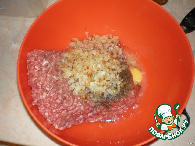 замесить фарш с луком, 2 яйцами, солью, перцем
