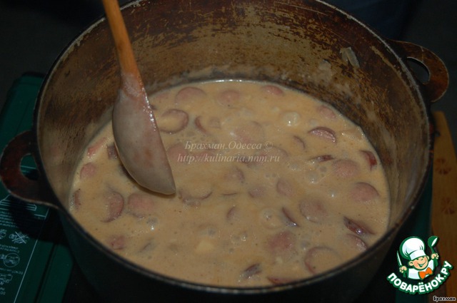 Когда лук принял красивый золотистый цвет, добавляем колбаски и готовим еще 5 минут. Кстати, если под рукой имеются, скажем, ребра копченые, грудинка, подчеревок или еще какая сногсшибательская снедь, ее с удовольствием можно пустить в дело.