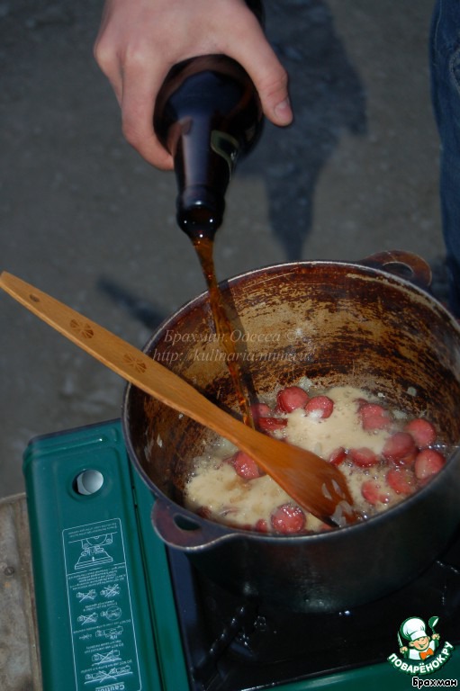 - Обжарилось? Замечательно. Заливаем пиво. Ждем, пока закипит и готовим 5 минут.